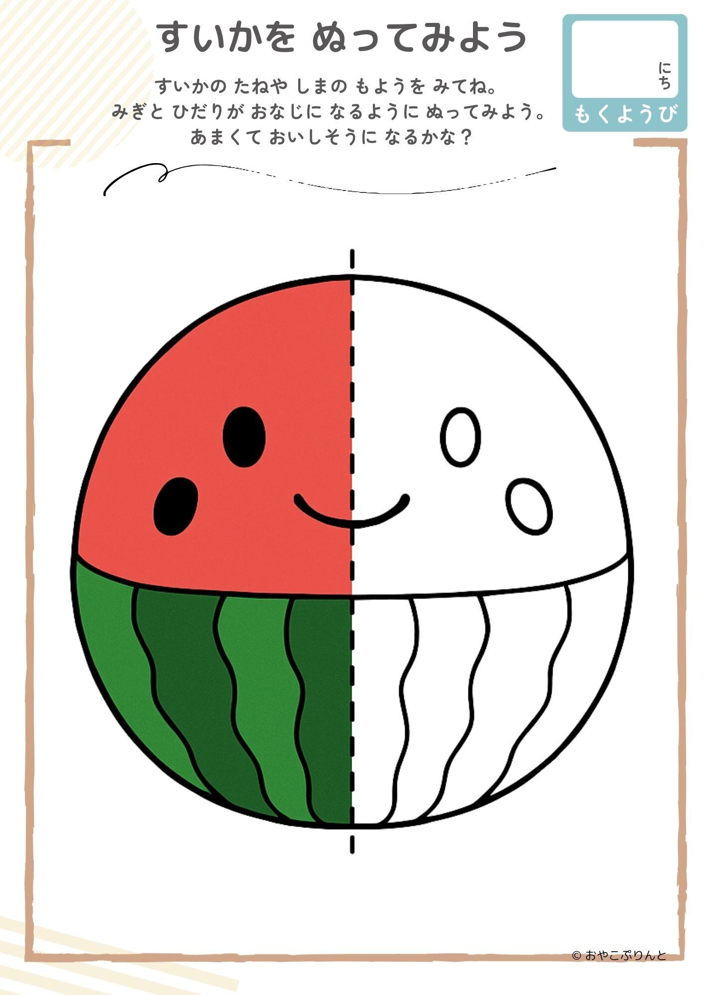 ・すいかをぬってみよう(しま模様やたねを観察して、おいしそうにぬってみよう)